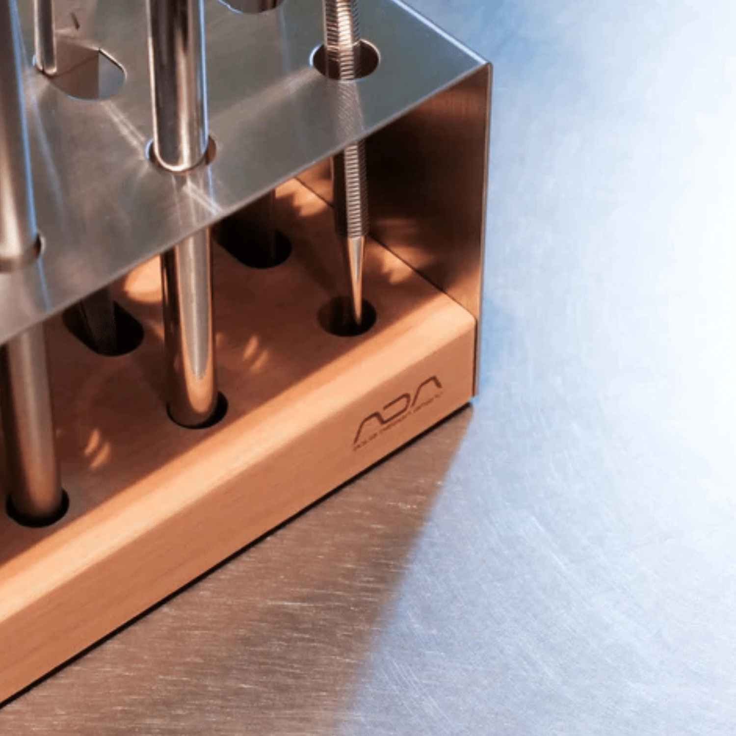 Den träbaserade delen fungerar som ett stöd som skyddar spetsarna på saxar, pincetter och andra precisionsverktyg. Det minskar slitage och hjälper till att bevara verktygens funktion över tid.
