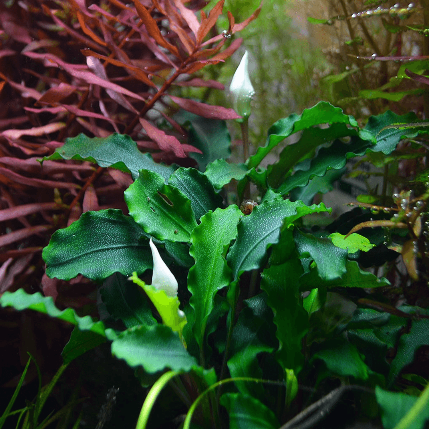 Bucephalandra pygmaea ’Bukit Kelam’ är en kompakt och elegant Bucephalandra med små, smala blad som skimrar i mörkgrönt till metalliskt blått beroende på ljus och näring. Bladens yta har en vacker glans och lätt vågig struktur som fångar ljuset och ger en exklusiv känsla i aquascapes. Tack vare sitt långsamma växtsätt och lilla storlek passar den perfekt för nanoakvarier och detaljerade hardscape-layouts.