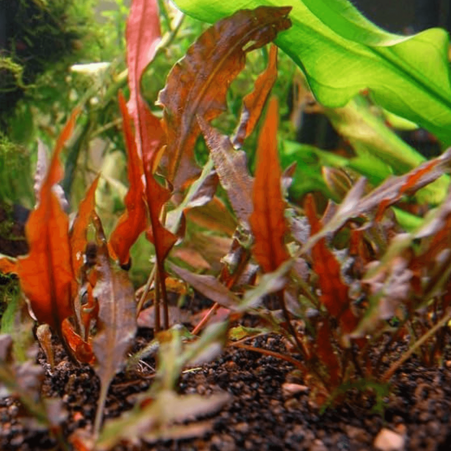 Cryptocoryne wendtii ‘Mi Oya’ – Invitro används främst som midground plant men fungerar även i foreground i större layouter. Plantera små portioner med några centimeters mellanrum så att plantorna kan växa ihop naturligt över tid. Dess bronsröda blad kontrasterar vackert mot ljusare växter som Cryptocoryne wendtii ‘Green’ eller Hygrophila pinnatifida.