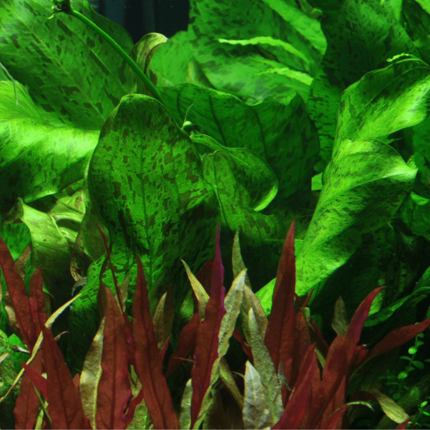 Echinodorus ‘Ozelot Green’ gör sig bäst som midground- eller background-växt i medelstora till stora akvarier. Plantera den i näringsrikt substrat med gott om plats runt sig – den sprider sig med tiden och kan dominera mindre layouter. Kombinationen av ljusgröna blad och mörka mönster skapar ett levande uttryck, särskilt i kontrast mot röda växter eller mörk hardscape.