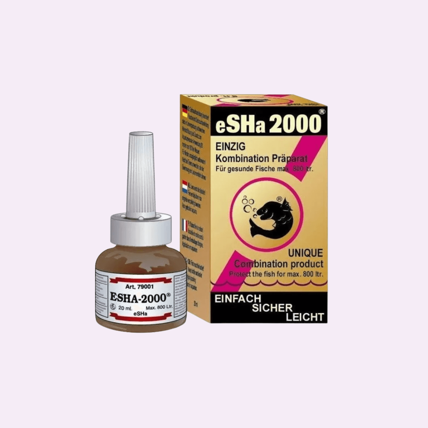 Observera: eSHa 2000 bör användas enligt medföljande doseringsanvisningar. Undvik att kombinera med andra starka mediciner utan rådgivning. Produkten påverkar inte växter, räkor eller snäckor i korrekt dosering.