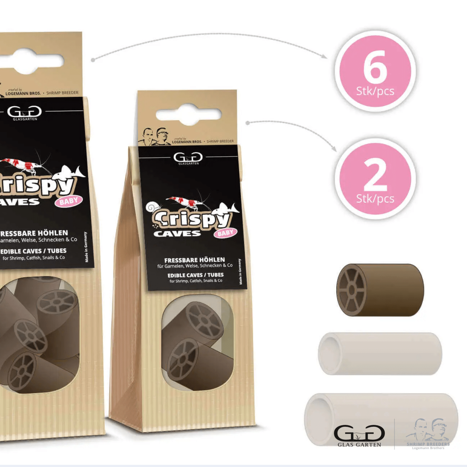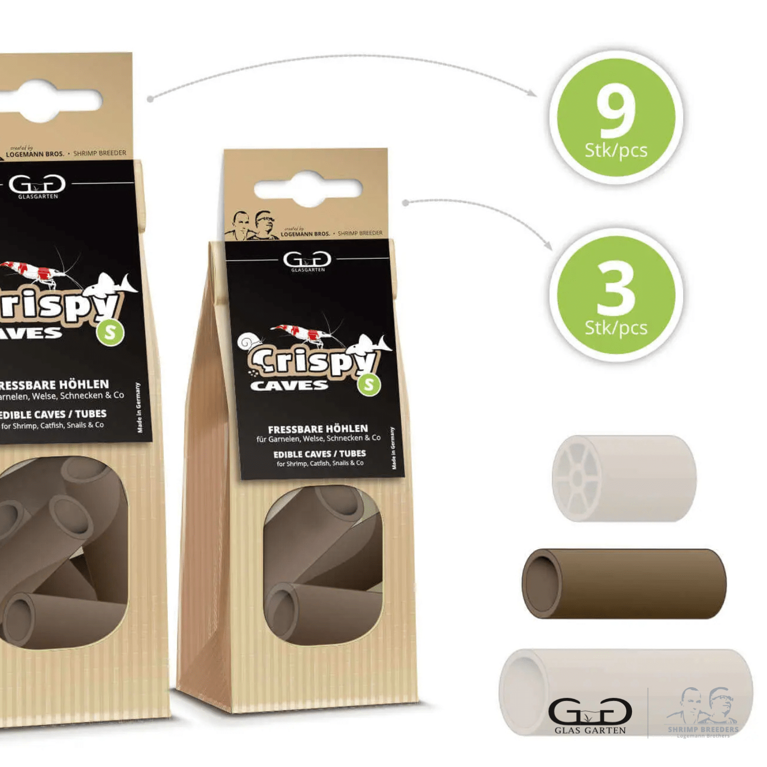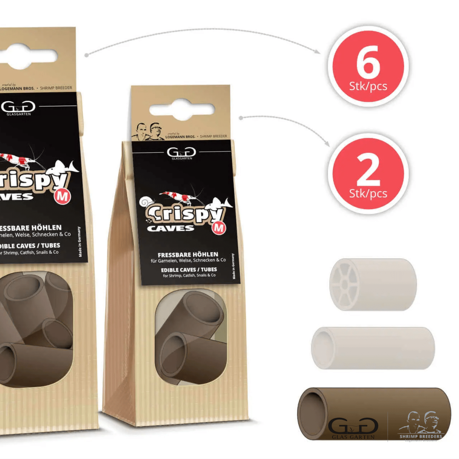 GlasGarten Crispy Caves är unika ätbara grottor som kombinerar gömställe och foder i ett. Tillverkade av naturliga fibrer och blad skapar de en perfekt miljö för räkor, sniglar, kräftor och algätande fiskar – samtidigt som de bidrar till en naturlig kost.