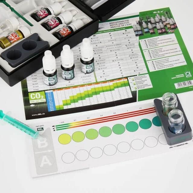 Testerna är lätta att utföra: fyll kyvetten med akvarievatten, tillsätt indikator och jämför färgen med färgskalan – eller räkna droppar tills färgen ändras vid KH-testet. Jämförelsesystemet tar hänsyn till vattnets egen färg för extra noggranna resultat.