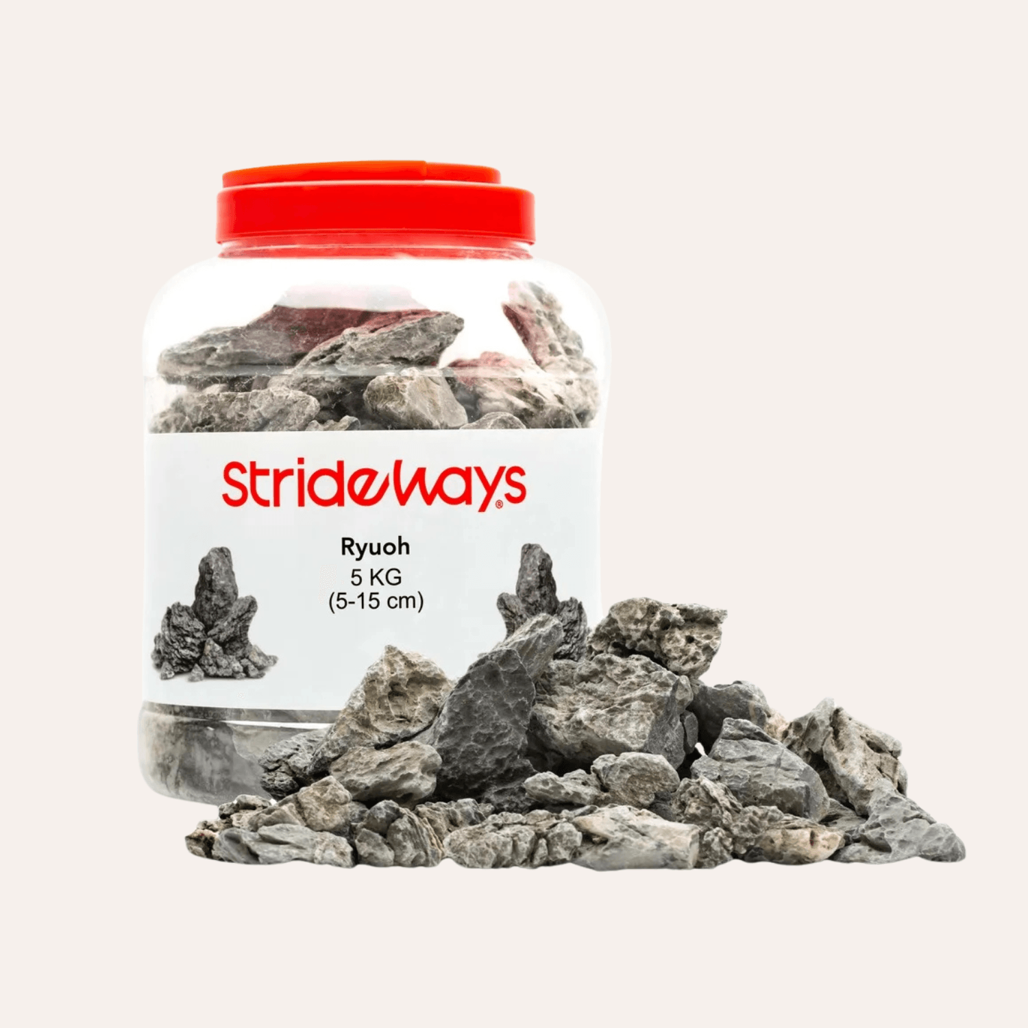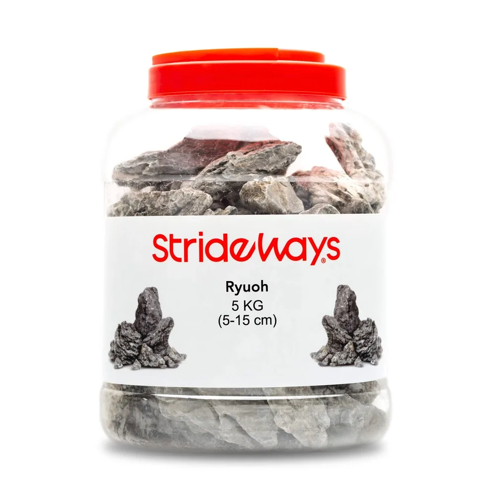 Ryuoh Stone är en ikonisk sten inom aquascaping, särskilt uppskattad i Iwagumi-layouts där dess kraftiga ådringar, tydliga struktur och naturliga form skapar djup, kontrast och visuell balans. Dess karaktäristiska gråvita marmorering gör den till ett perfekt val för dig som vill skapa ett dramatiskt och naturligt undervattenslandskap.Utöver sitt estetiska värde är Ryuoh Stone kalkrik, vilket innebär att den långsamt frigör kalcium i vattnet. Detta bidrar till att höja pH och vattnets hårdhet (GH/KH) – idealiskt för ciklider, snäckor, vissa räkor och andra arter som trivs i hårdare, mineralrika miljöer.Ryuoh passar också utmärkt i terrarier där stenens kalciuminnehåll kan gynna reptiler och amfibier, eller användas som en dekorativ struktur i naturlika landskap.Levereras i en 5 kg flaska med blandade stenar (ca 5–15 cm), färdiga att användas direkt i akvarium eller terrarium.