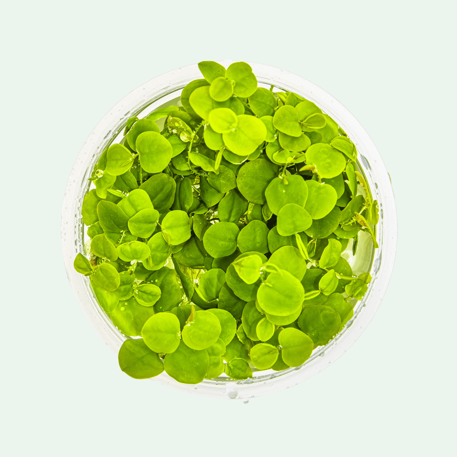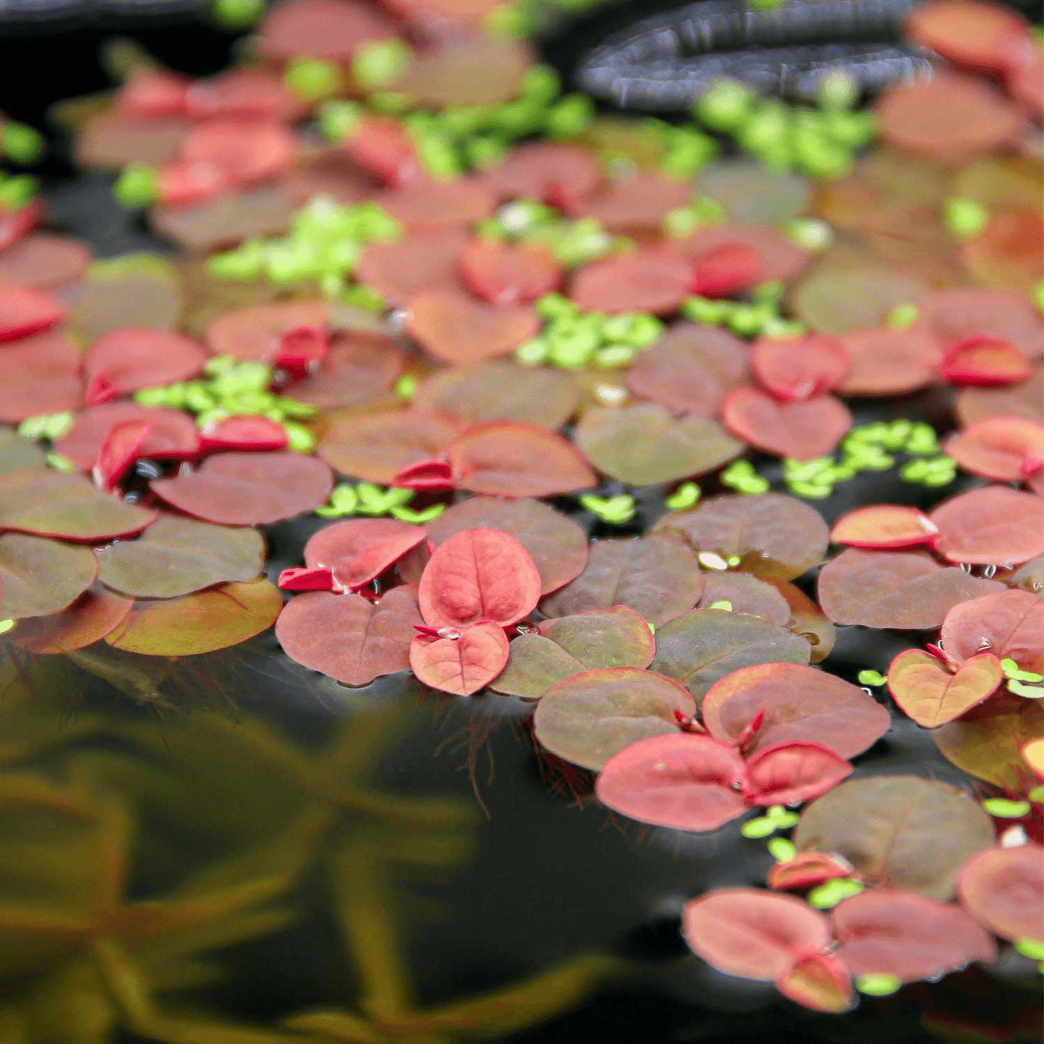 Phyllanthus fluitans är en elegant och mycket dekorativ flytväxt som ofta kallas “Red Root Floater”. Den kännetecknas av sina runda, tjocka blad med en sammetslik yta och de karakteristiska röda rötterna som hänger ner i vattnet. Under stark belysning och låg nitrathalt får bladen en intensiv röd eller kopparfärgad ton. Den skapar ett lugnt, naturligt intryck och används ofta för att dämpa ljus och ge skugga i akvariet.