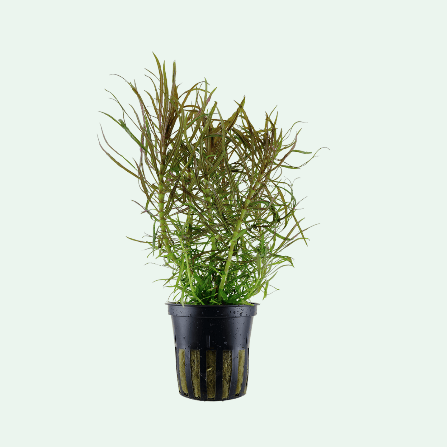 Pogostemon stellatus är en imponerande och kraftig stjälkväxt som utmärker sig genom sina långa, smala blad och sina spektakulära färgvariationer. Under stark belysning och med god näring visar den upp allt från ljusgrönt till djupt rödviolett, vilket gör den till ett fantastiskt inslag i akvariets bakgrund. Dess stjärnformade bladkransar ger ett unikt och dramatiskt uttryck som passar perfekt i layoutens mittpunkt eller bakre sektioner.