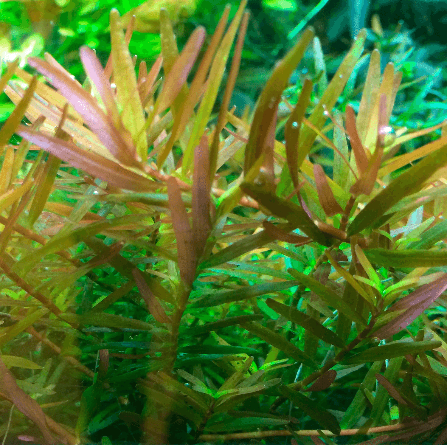 Observera: Rotala rotundifolia ’H’ra’ – Invitro får sina mest intensiva orange-röda färger vid stark belysning, stabil CO₂ och lätt nitratbrist. I svagare ljus blir växten mer grön och mindre kompakt.
