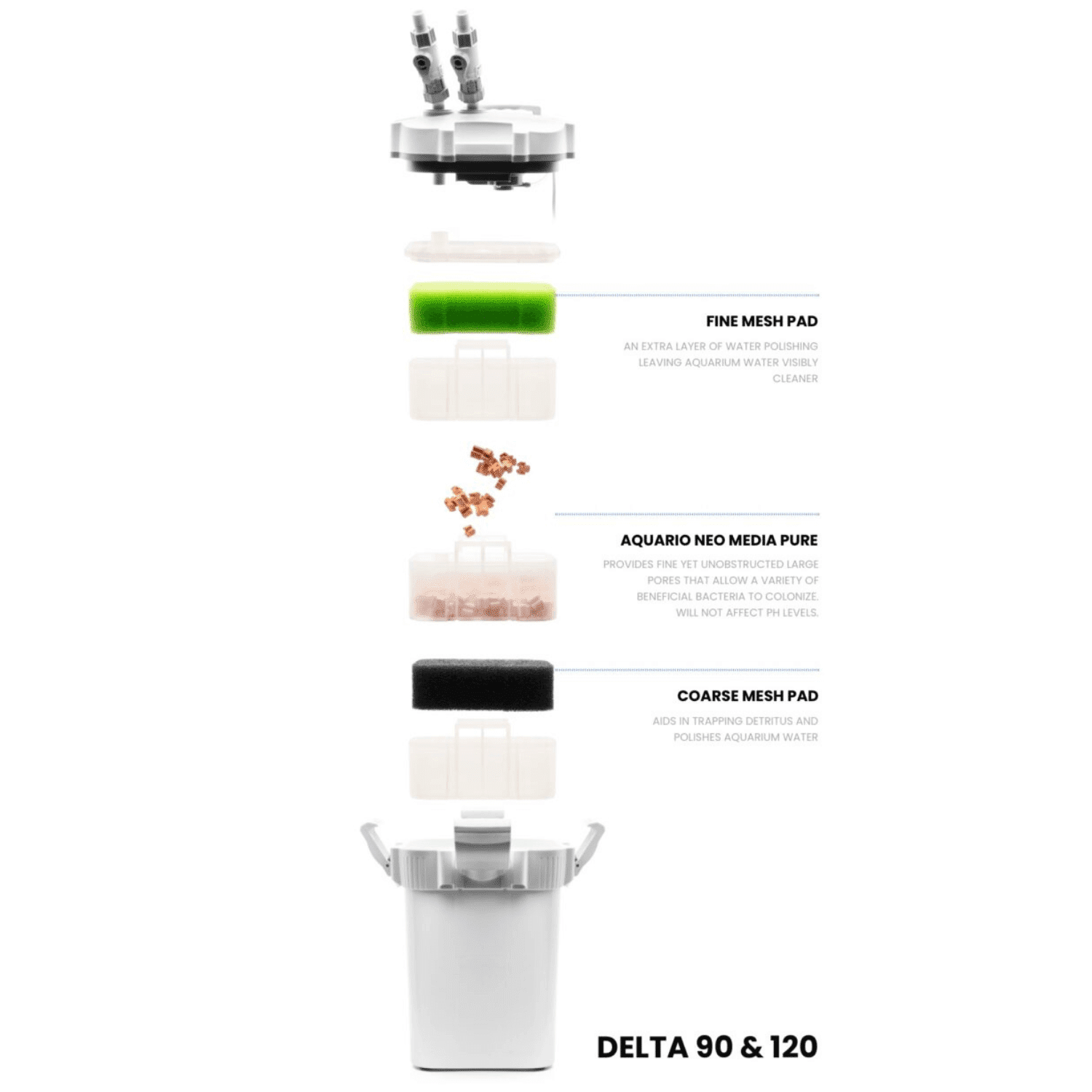 Filtret kombinerar mekanisk, biologisk och kemisk filtrering i tre stora mediekammare. Detta möjliggör djup rengöring, snabb nedbrytning av avfall och klarare vatten. Delta 120 är dessutom extremt lättservat, tack vare sina organiserade filterkorgar och robusta design.