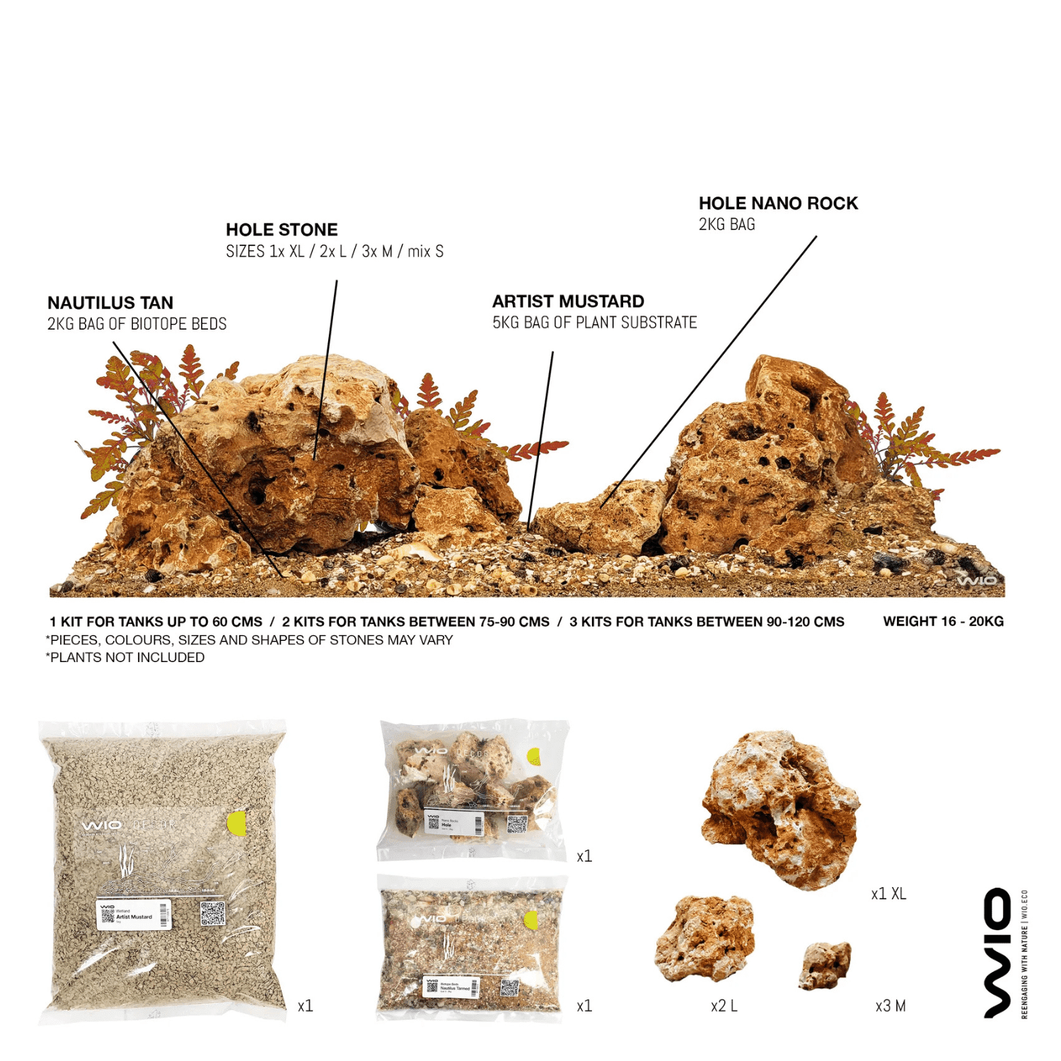 Nautilus Tan Biotope Bed består av en harmonisk blandning av snäckskal i olika storlekar, naturligt färgad sand och brutna skalfragment. Detta skapar en ljus, varm botten med tydlig struktur och naturlig variation – perfekt för sjö- och strandbiotoper. Som hardscape ingår WIO Hole Stones, porösa stenar med håligheter och mjuka former i nyanser från ljust beige till varm ockra. Dessa stenar ger inte bara visuell variation utan erbjuder även naturliga gömställen och territorier för fisk och ryggradslösa djur. Som bas ingår Wetland Artist “Mustard”, ett ljust och näringsrikt substrat som stödjer växttillväxt och samtidigt förstärker den varma färgpaletten i layouten.