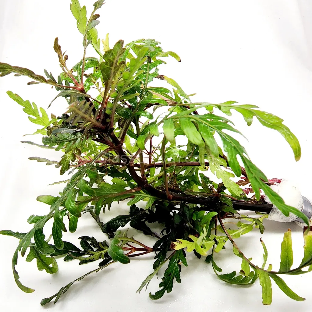 Hygrophila pinnatifida (etablerad) är en dekorativ växt med djupt flikiga blad och unika brons- till vinröda toner. Redo att planteras direkt – fullt anpassad till undervattensmiljö!