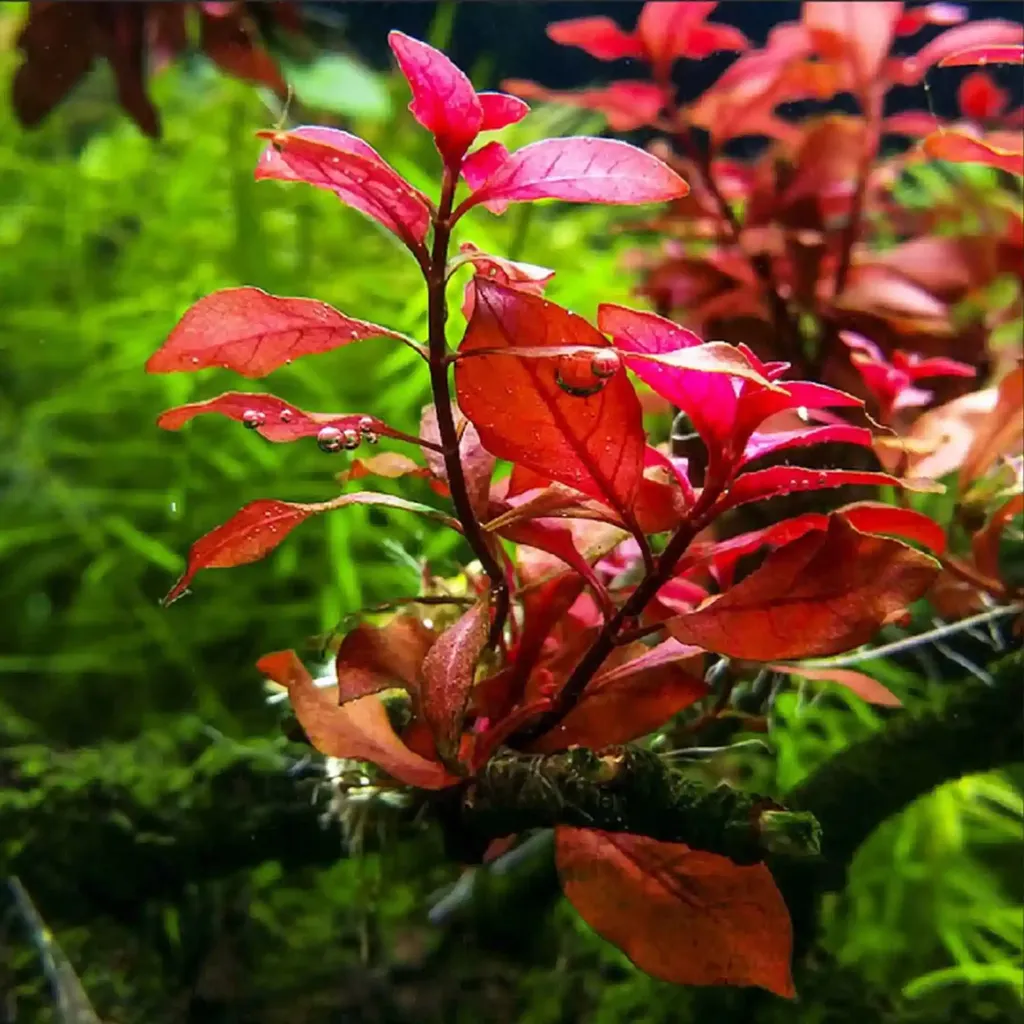 Ludwigia palustris 'Super Red' är en av de mest färgstarka röda växterna inom akvariehobbyn. Med sina djupt röda till vinröda blad skapar den en dramatisk kontrast till grönare växter och är ett självklart blickfång i layouten. Den har ett kompakt växtsätt och fungerar bäst som gruppväxt i mellan- eller bakgrundsdelar av akvariet.
